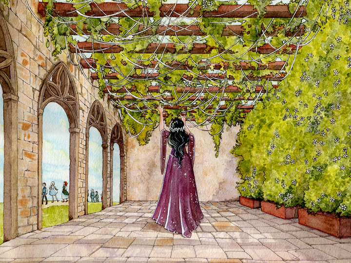 De grandes aquarelles aux décors enchanteurs dans lesquels je met en scène deux fillettes inspirées de mes enfants Gabrielle et Alice.